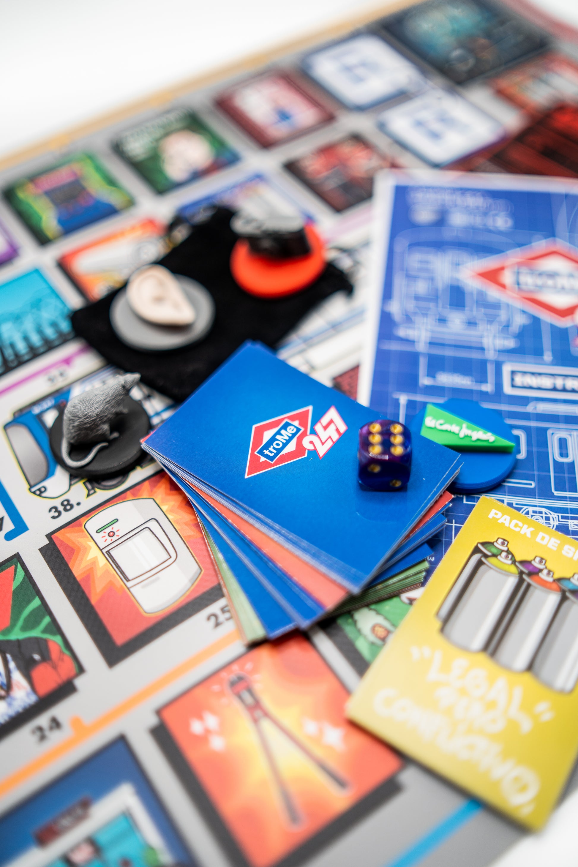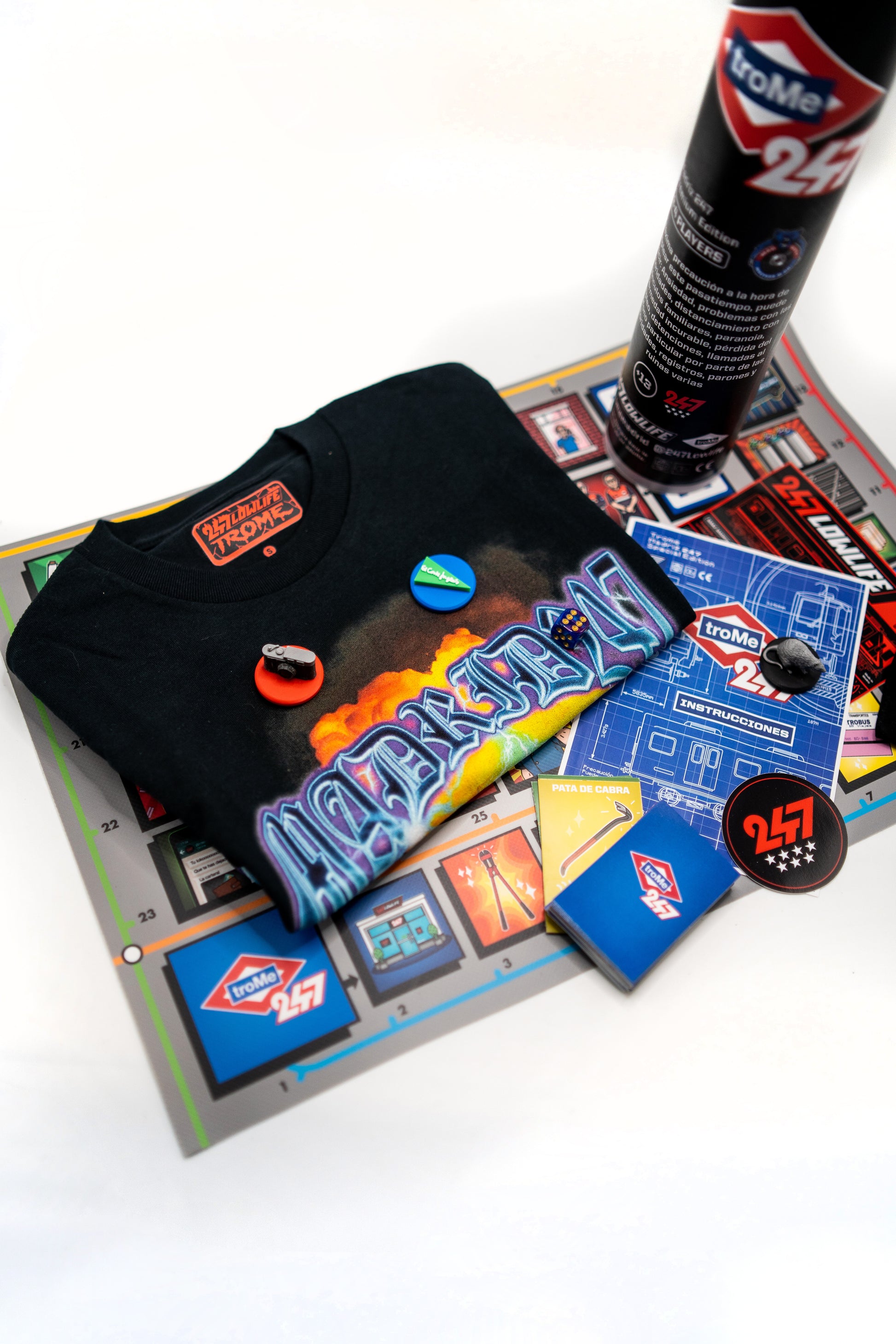 Este pack incluye en juego (Bote, tablero, 4 fichas 3D, dado, mazo de 64 cartas, instrucciones y bolsita de tela) y la infame camiseta Trome 247, una macarrada espectacular para vacilar al máximo.